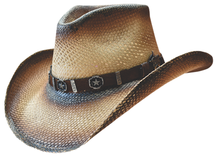 This fashionable straw hat is tea stained with a special Texas Star accents on a brown leather hatband. It is perfect for dressing up for a night out.