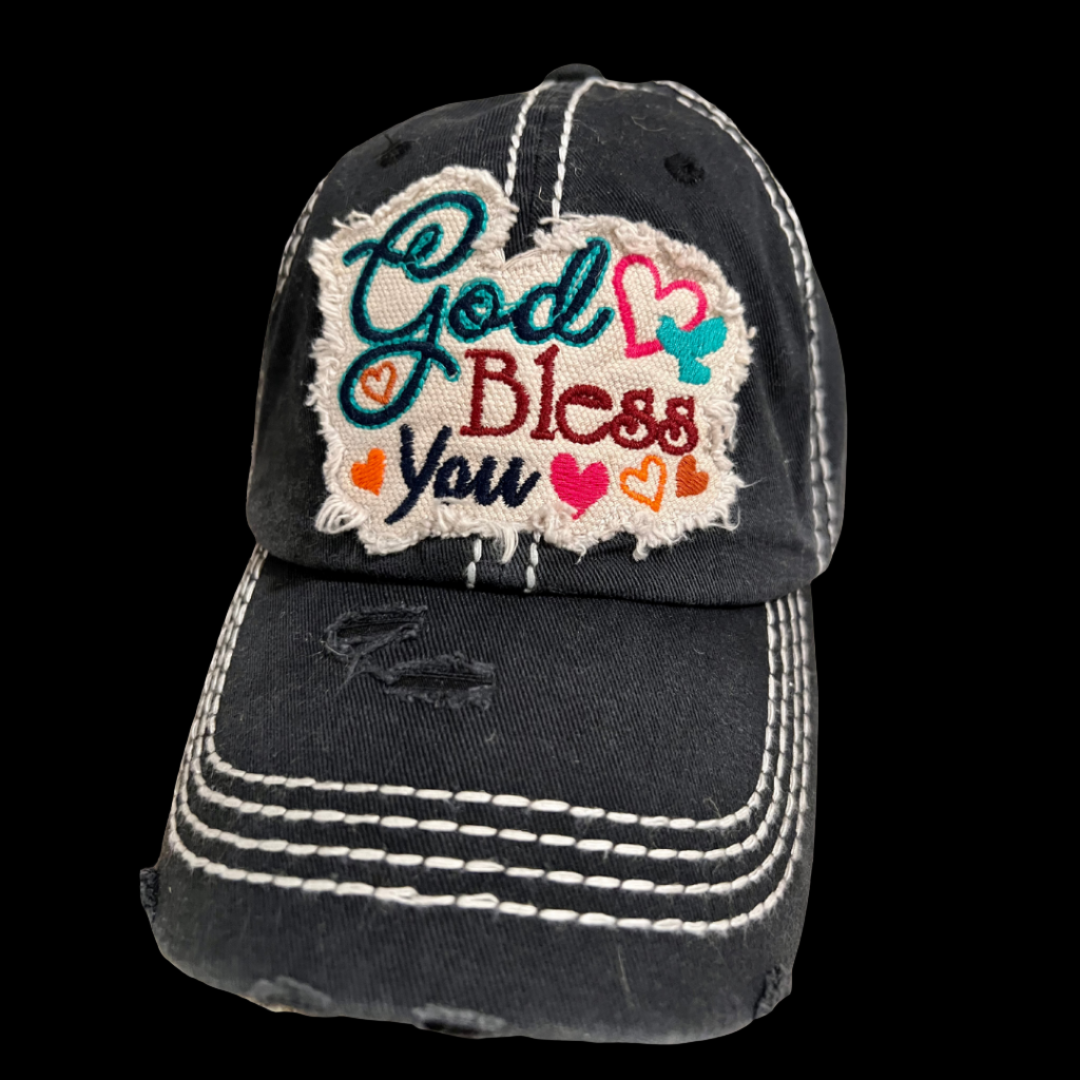 Black Distressed Washed Hat with White stitching. Beautiful embroidered patch that reads "God Loves You" a nice reminder to everyone you come in contact with! +