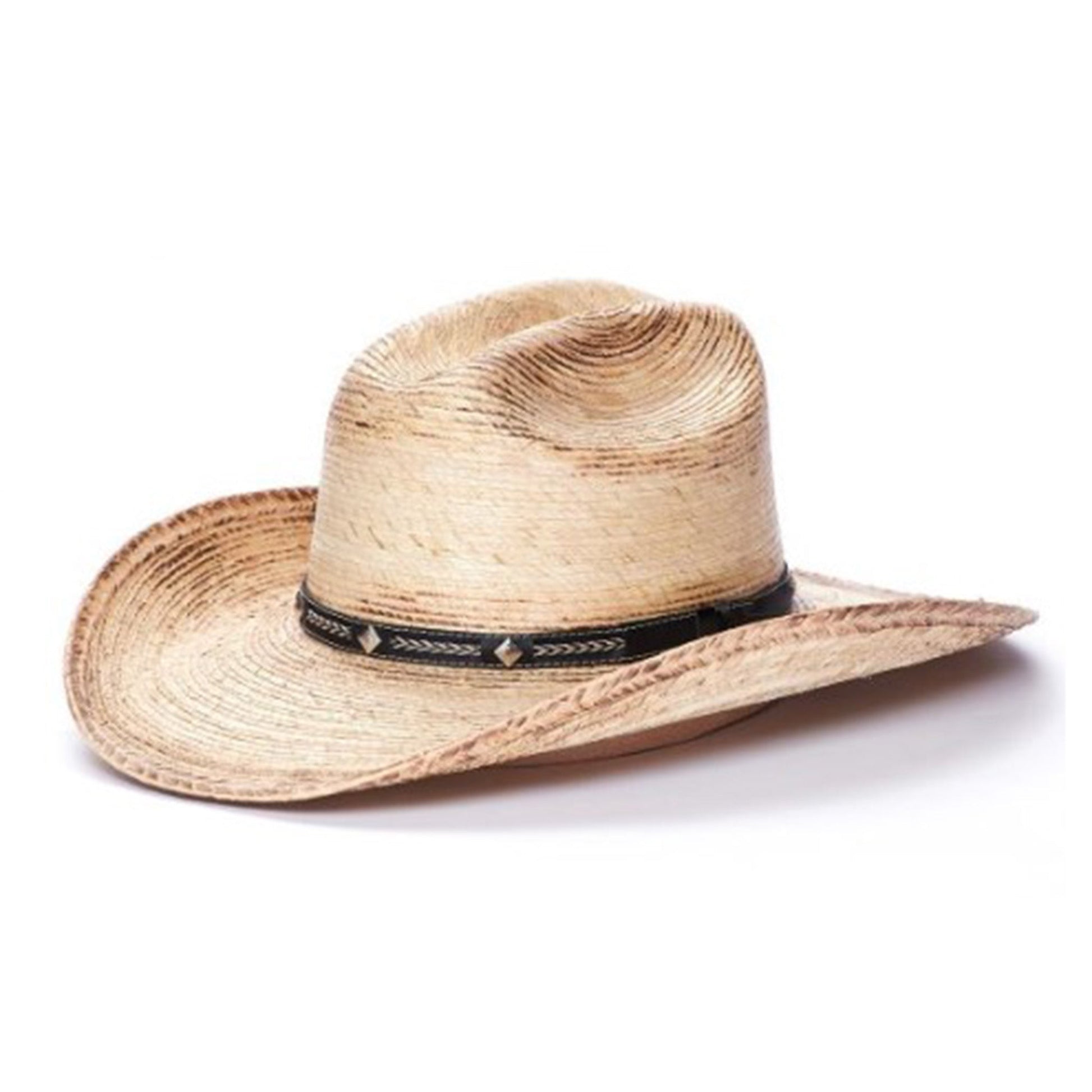 This Palm Leaf Western hat features a genuine leather band with stitching and studs.