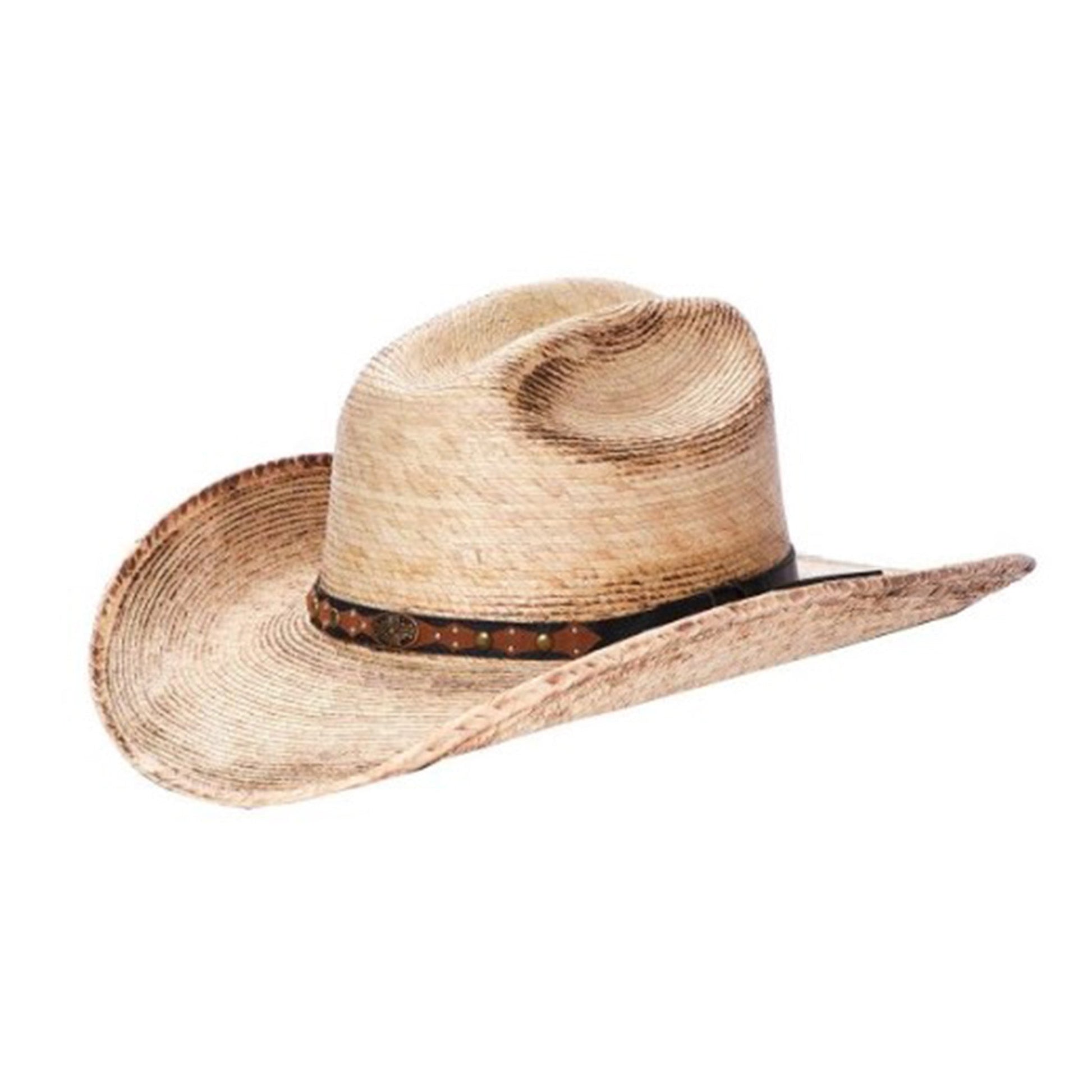 This western style hat is made with palm leaf. It features a black and brown leather band with stitching and studs.