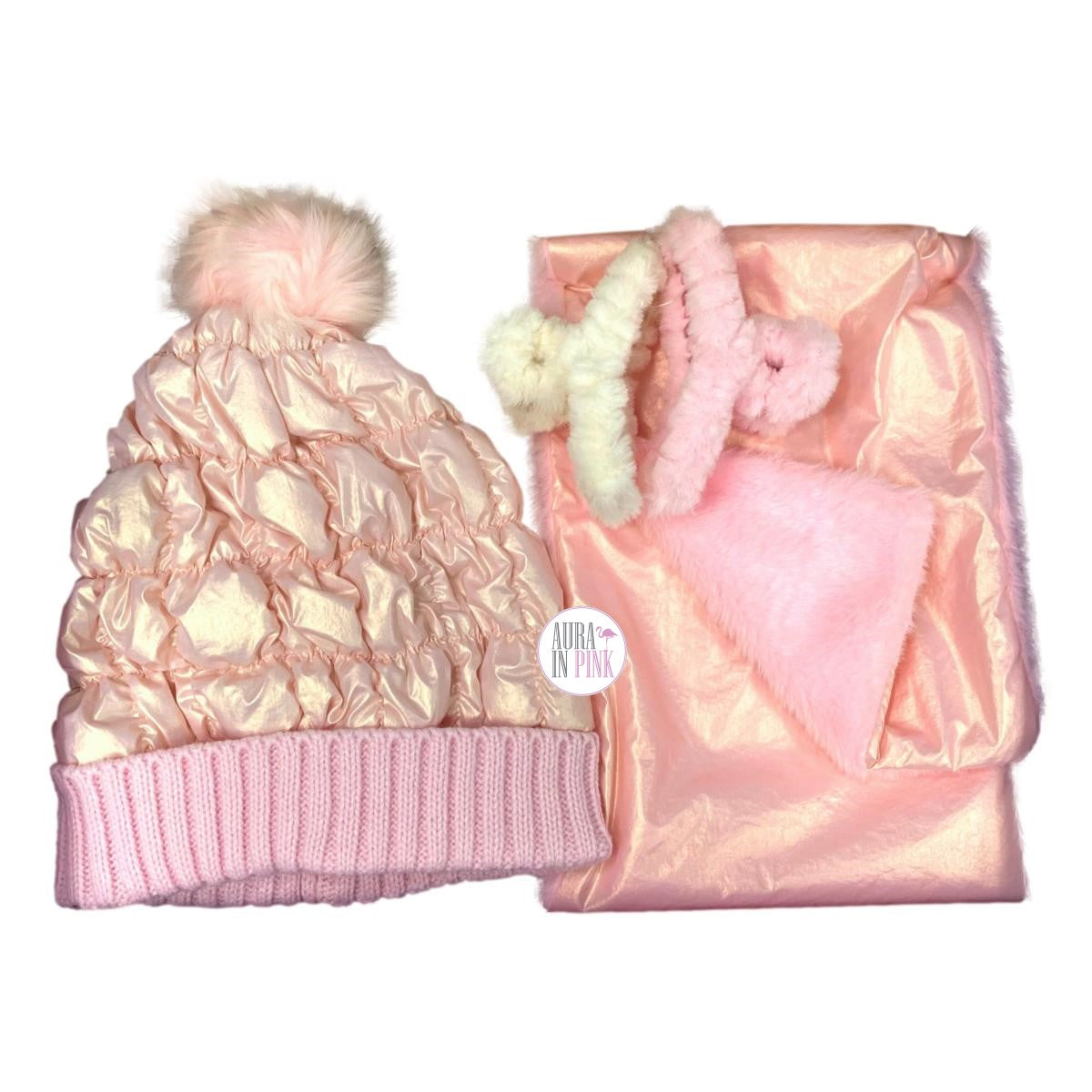 Rainbow Sugar Shimmering Rose Gold Pink Puffer Hat, Scarf & 2 Faux Fur Hair Claw Clips Boxed Set