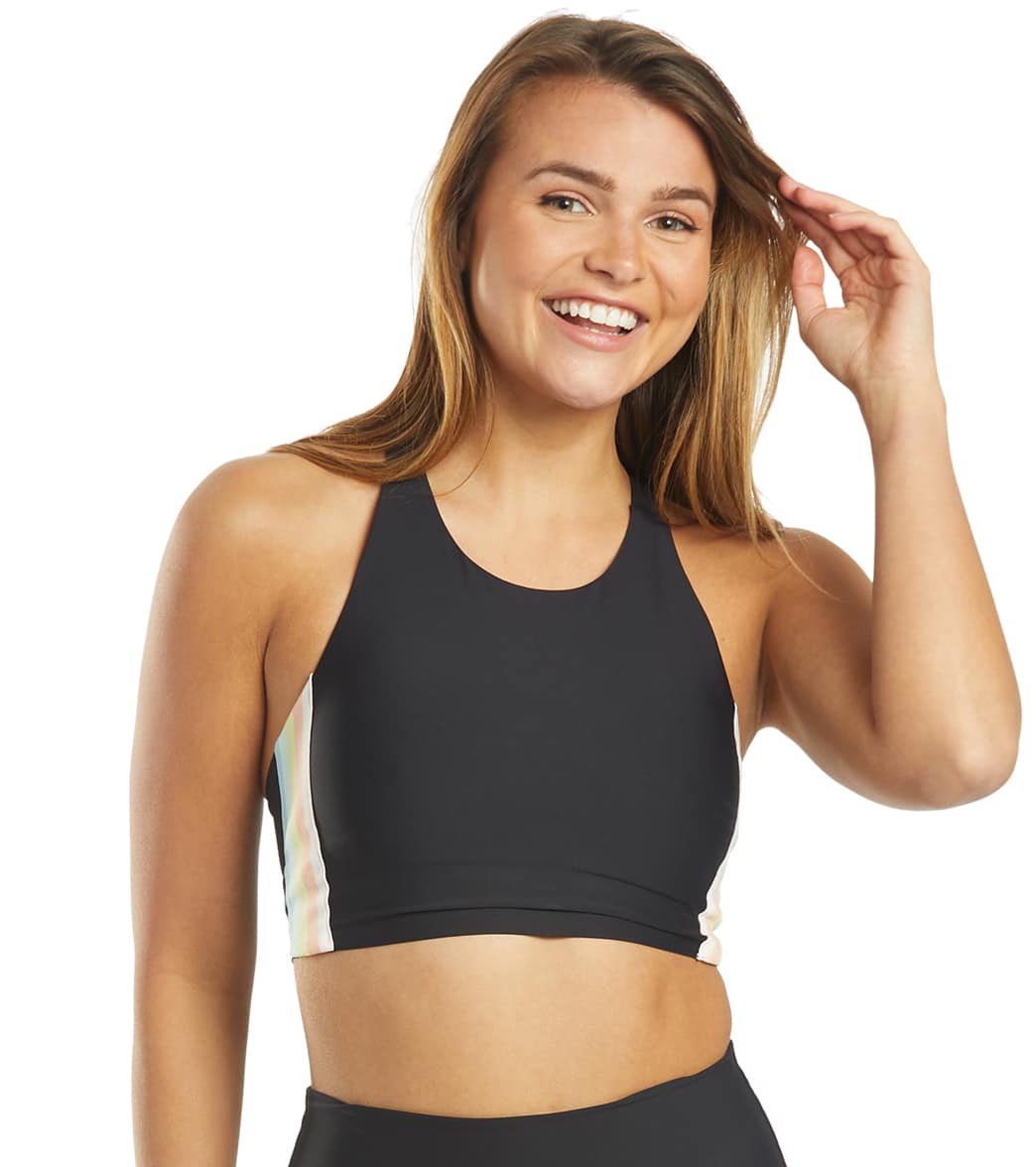 Chase rainbows in the Spiritual Gangster Solis Yoga Brami, a sports bra-cami hybrid featuring a racerback with triangle cutout and contrast rainbow side stripes.