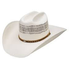 Here is a bangora straw that is durable enough for a hard day's work yet looks nice enough for a night out. The natural straw features a bangora vented crown for air flow. The hat is finished off with a brown leather hatband with silver diamond conchos and studs.
