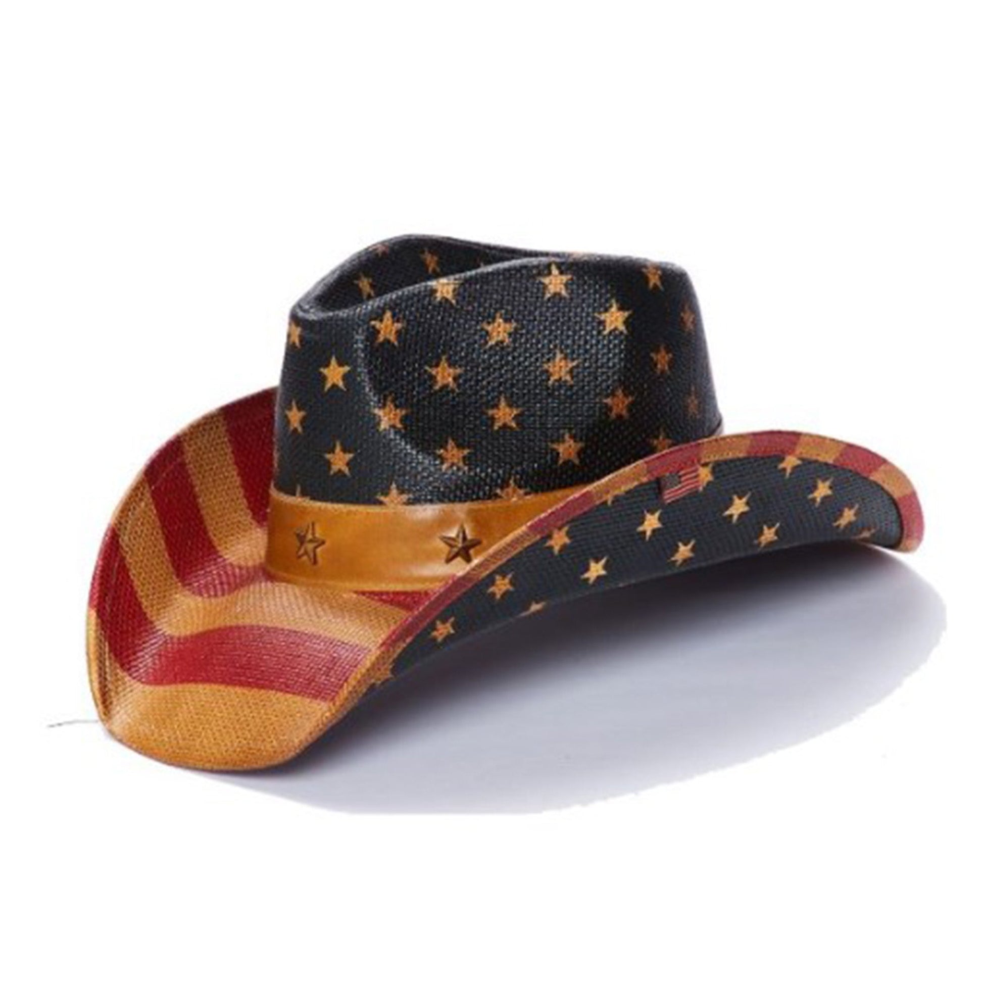 This vintage american flag print hat is made of genuine toyo straw and has a shapeable wired brim. It features a leather hat band with star pins.